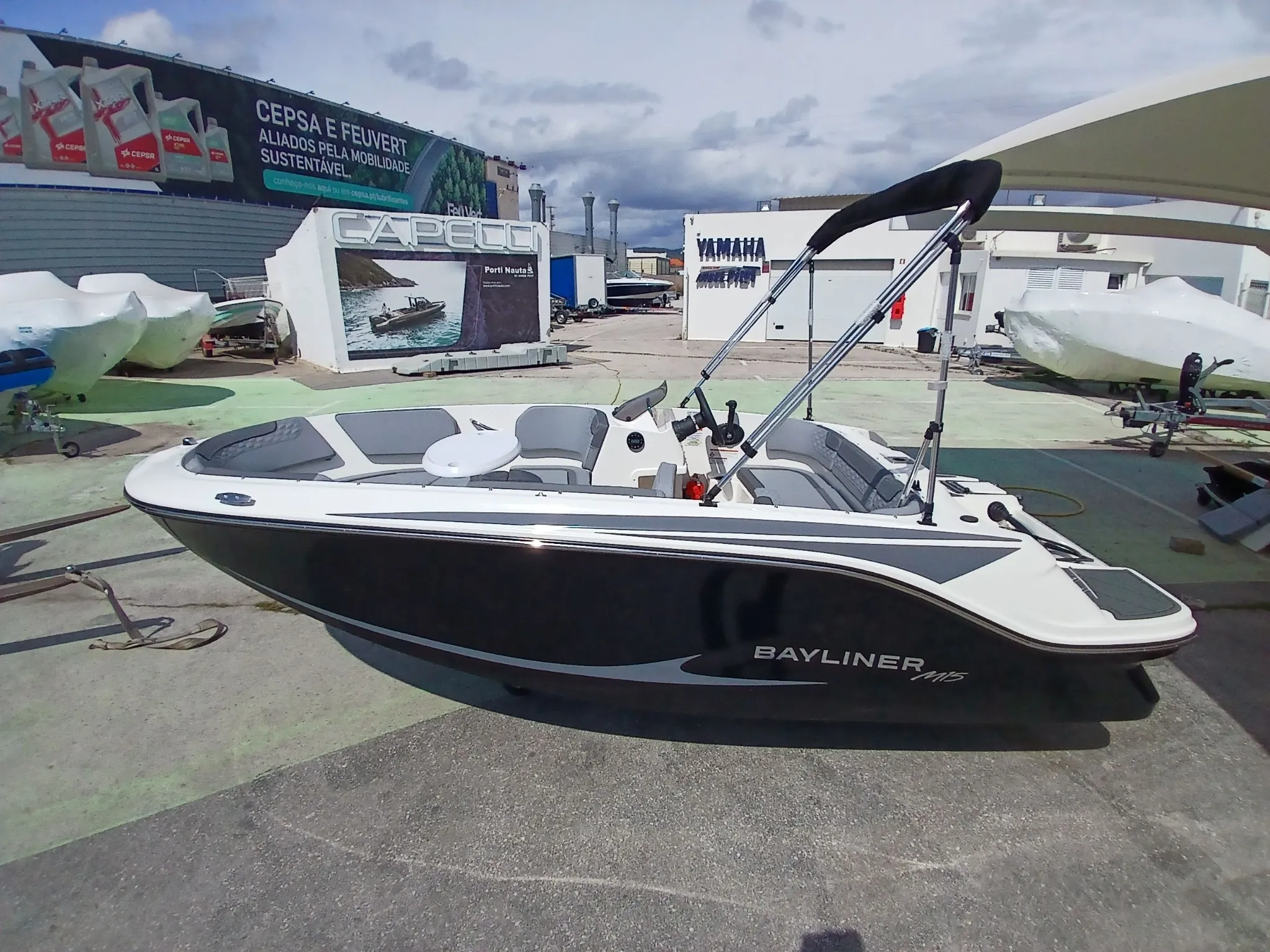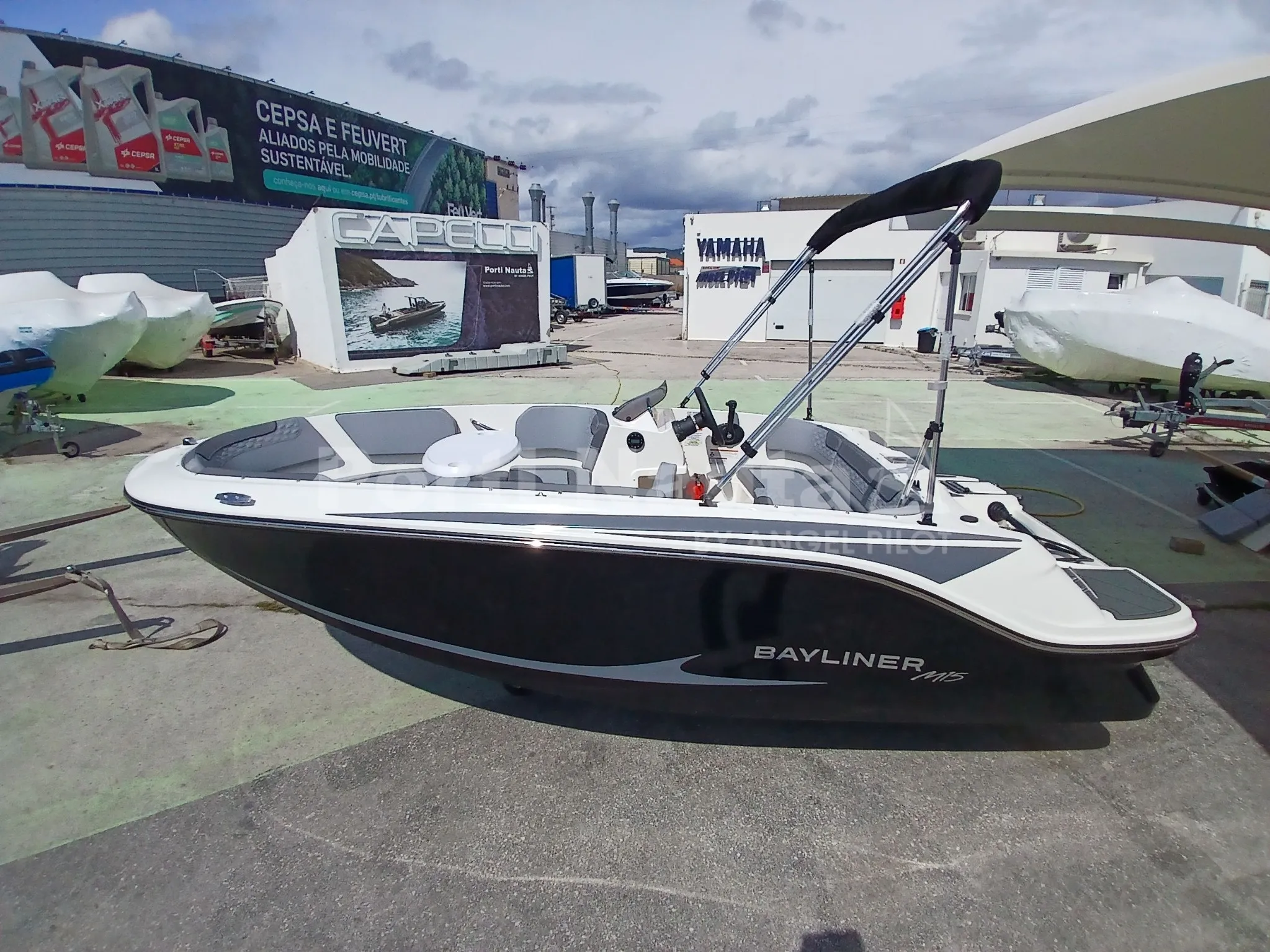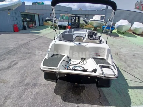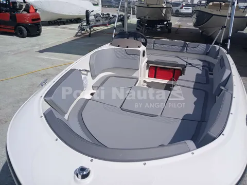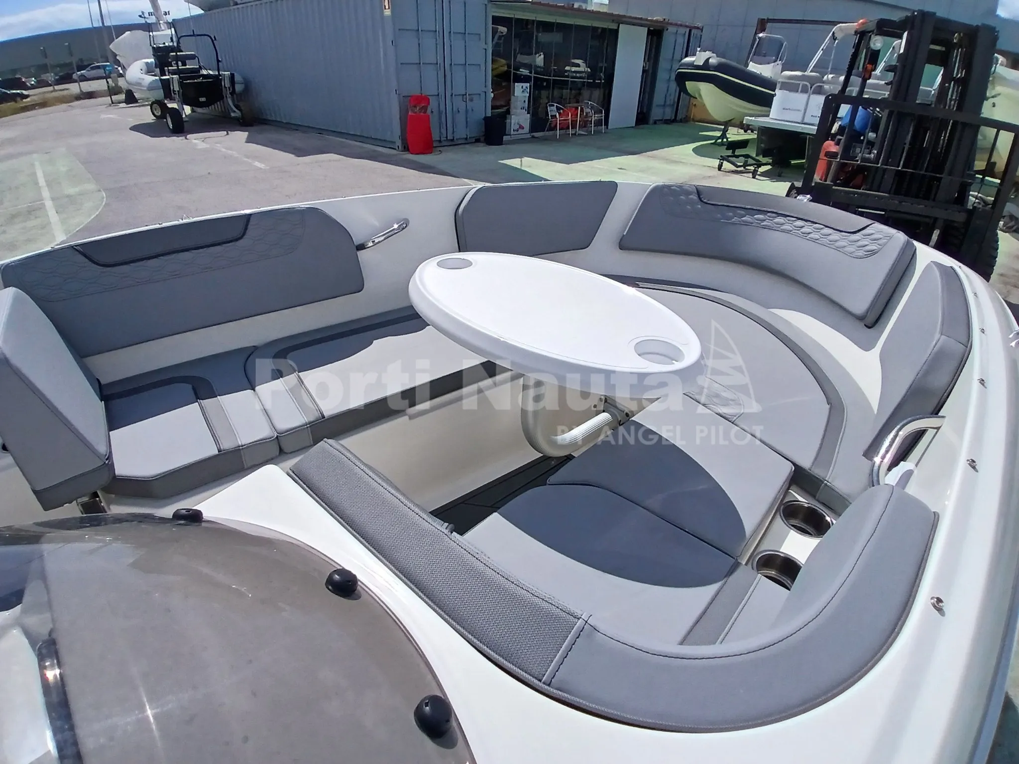 grelha da buzina, dobradiças, porta-copos e pegas) - Casco preto - Mastro de ski - Almofada oca à proa - Mesa de proa - Deck em teca