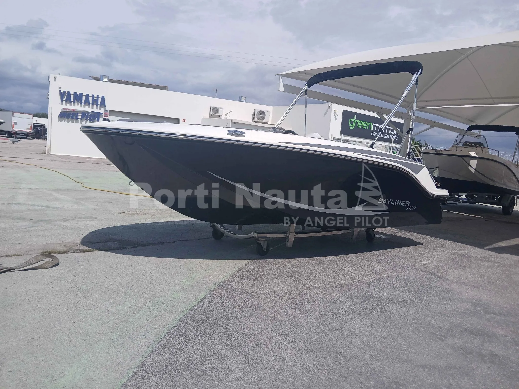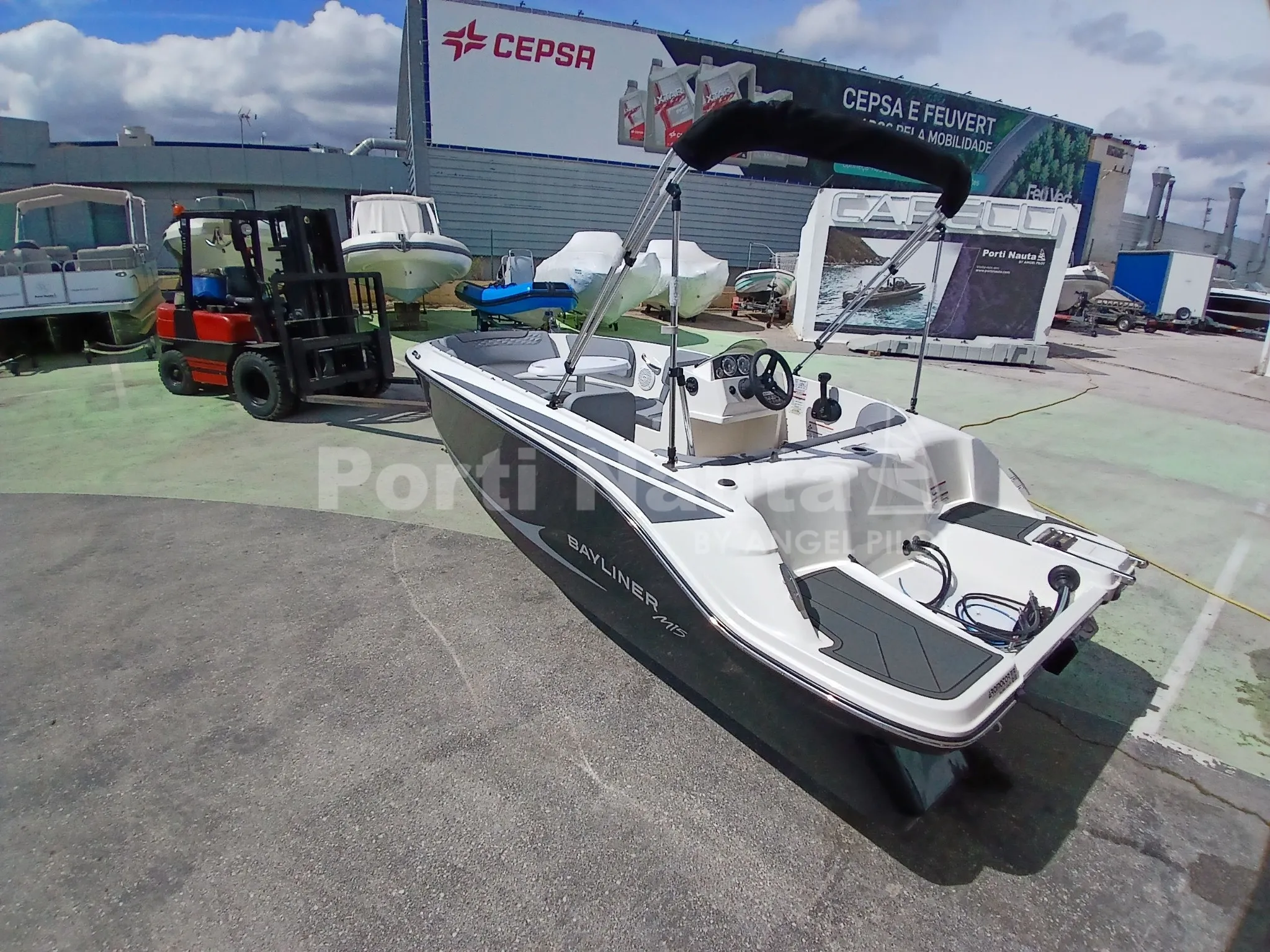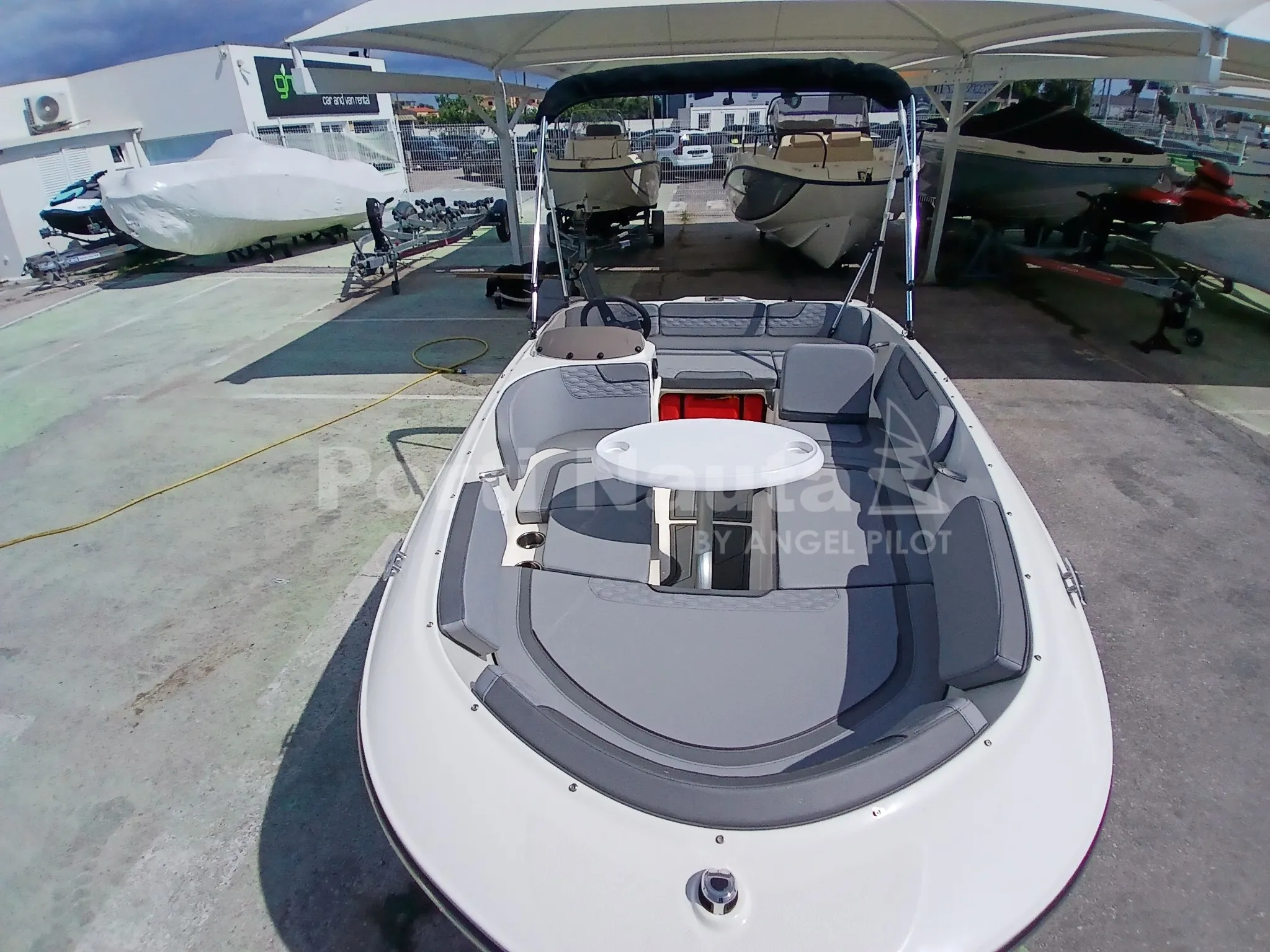grelha da buzina, dobradiças, porta-copos e pegas) - Casco preto - Mastro de ski - Almofada oca à proa - Mesa de proa - Deck em teca
