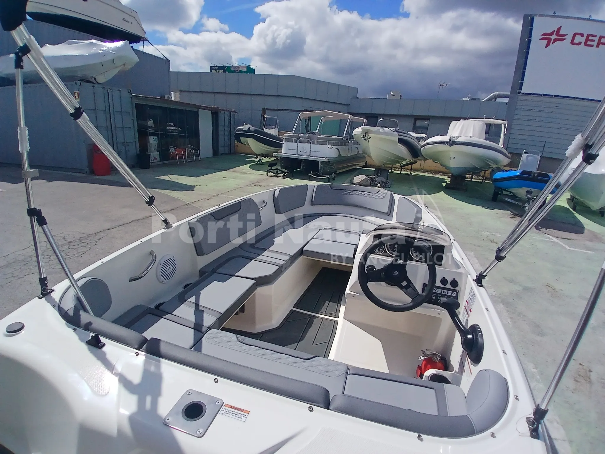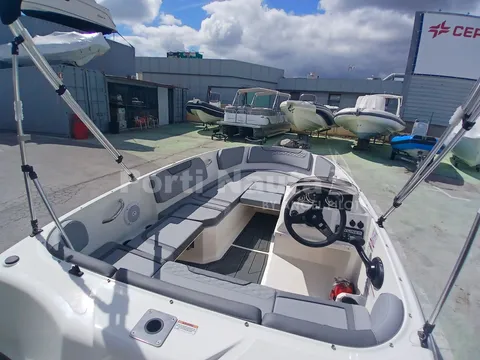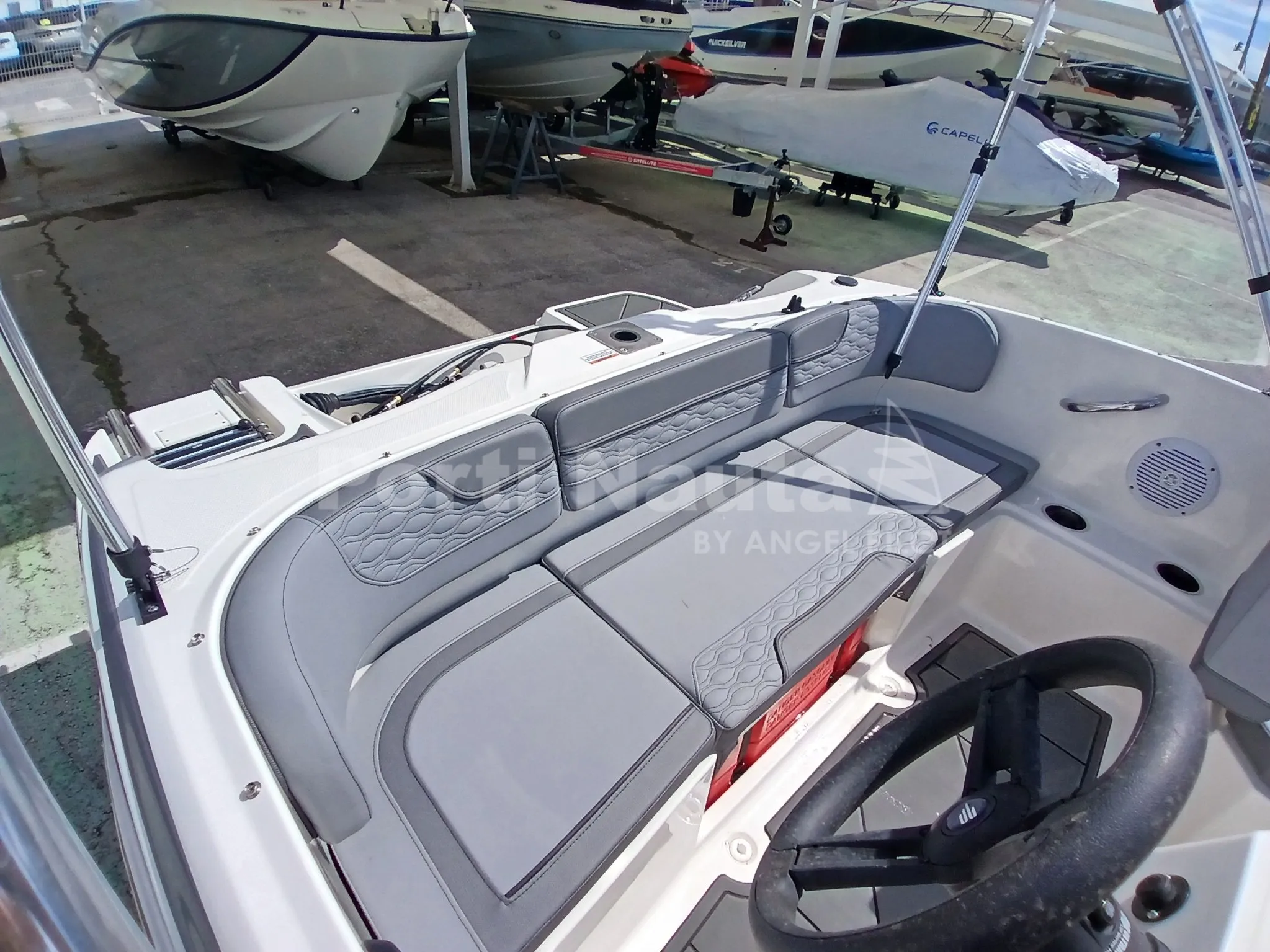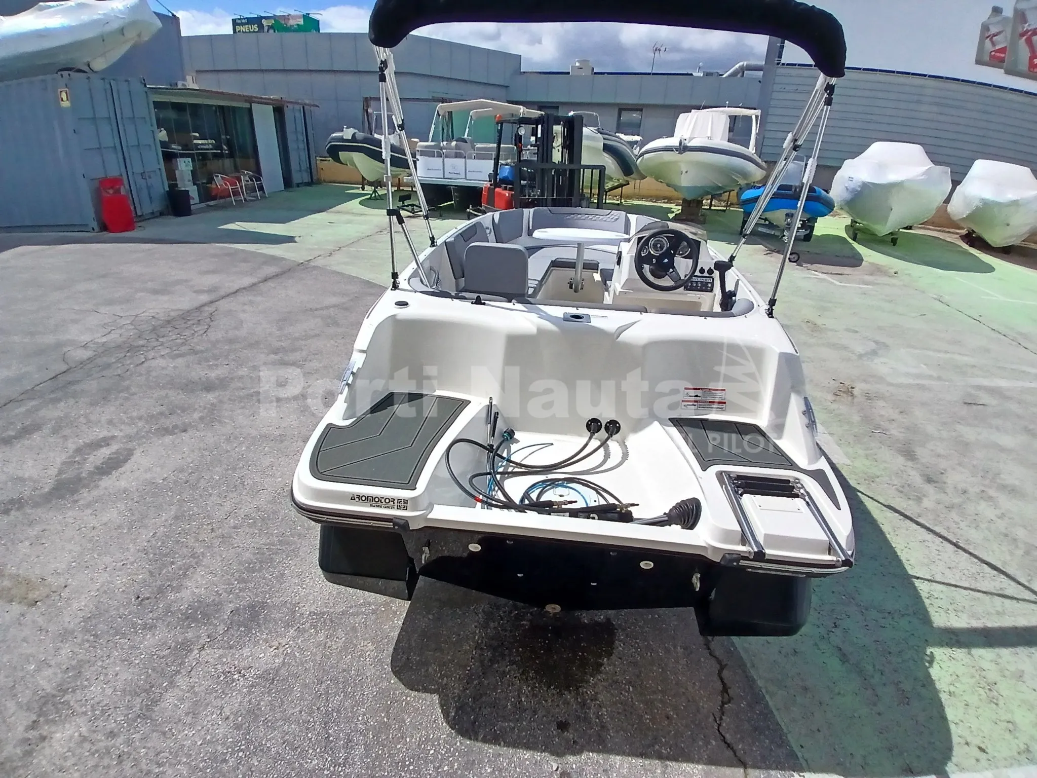 integrado na manete - Luzes de navegação 12V - Olhais de proa e popa (3) - Revestimento interior do piso em fibra de vidro - Para-brisas