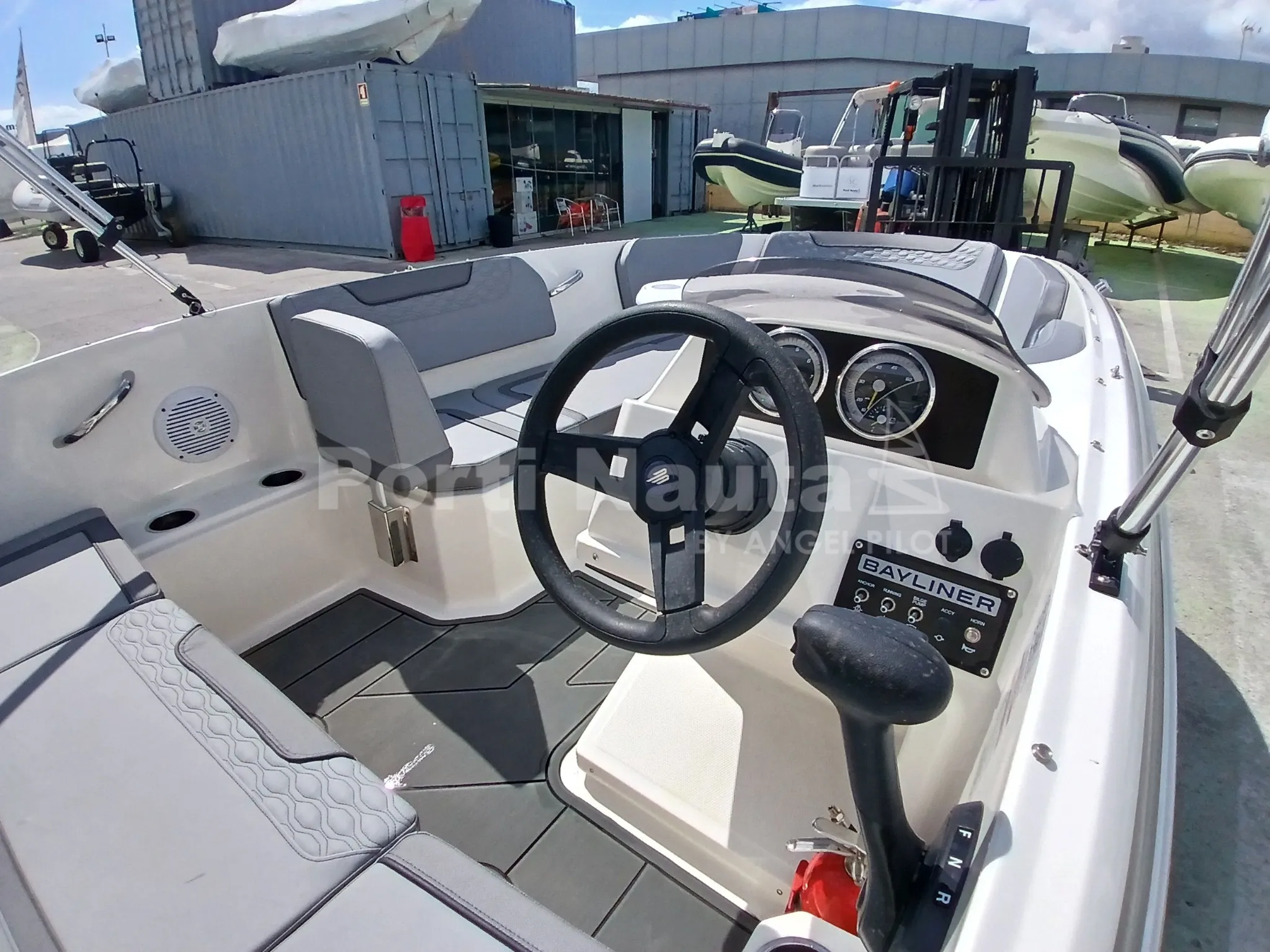 artificial macia (cinzenta) - Almofada oca a bombordo - Encosto a bombordo - Sistema de direção hidráulica - Sistema de som estéreo