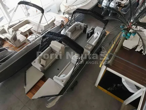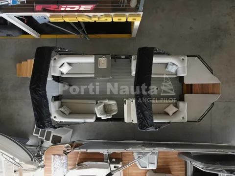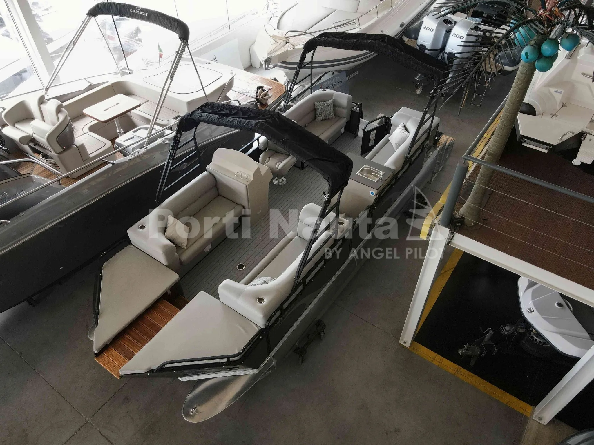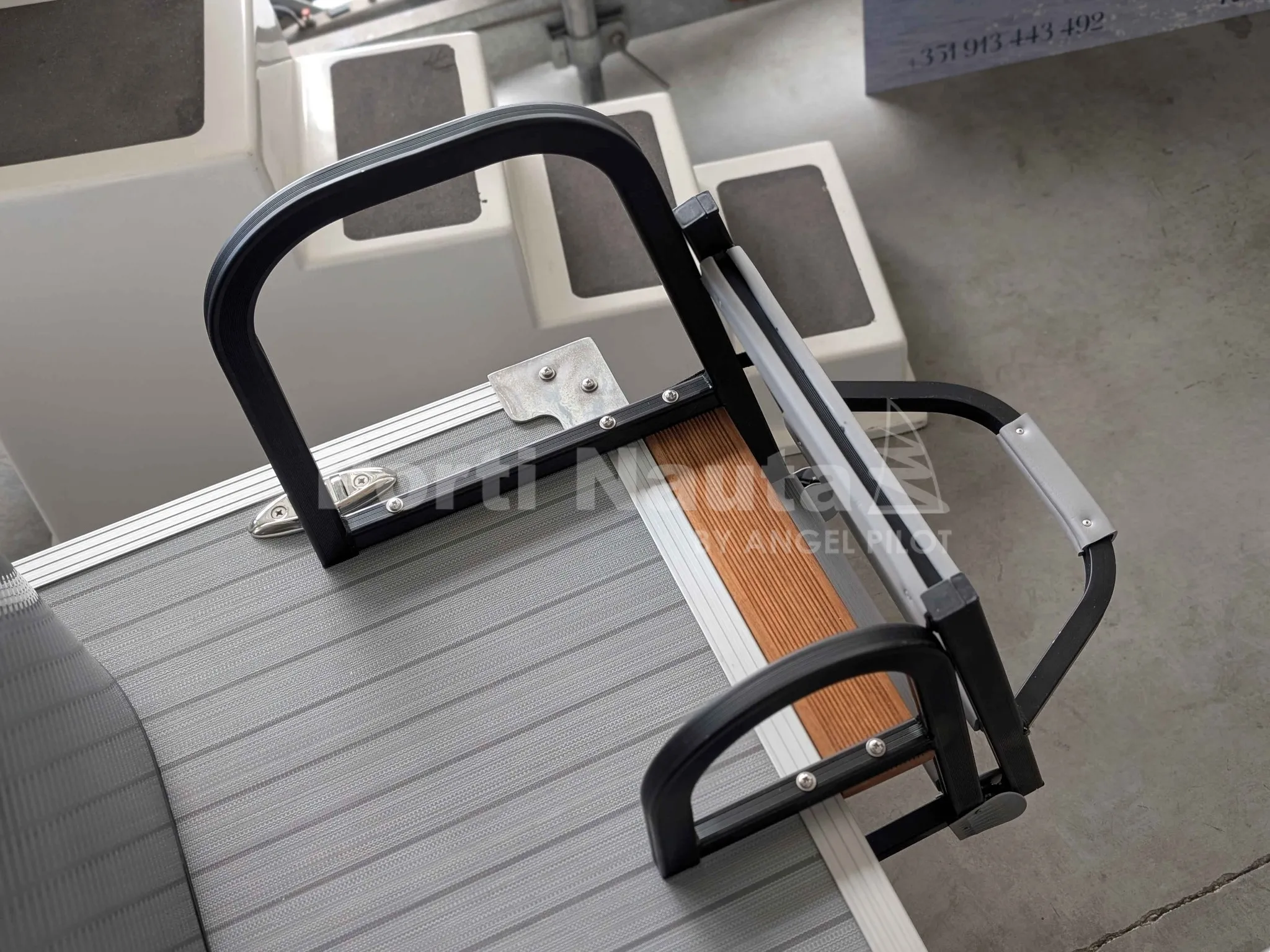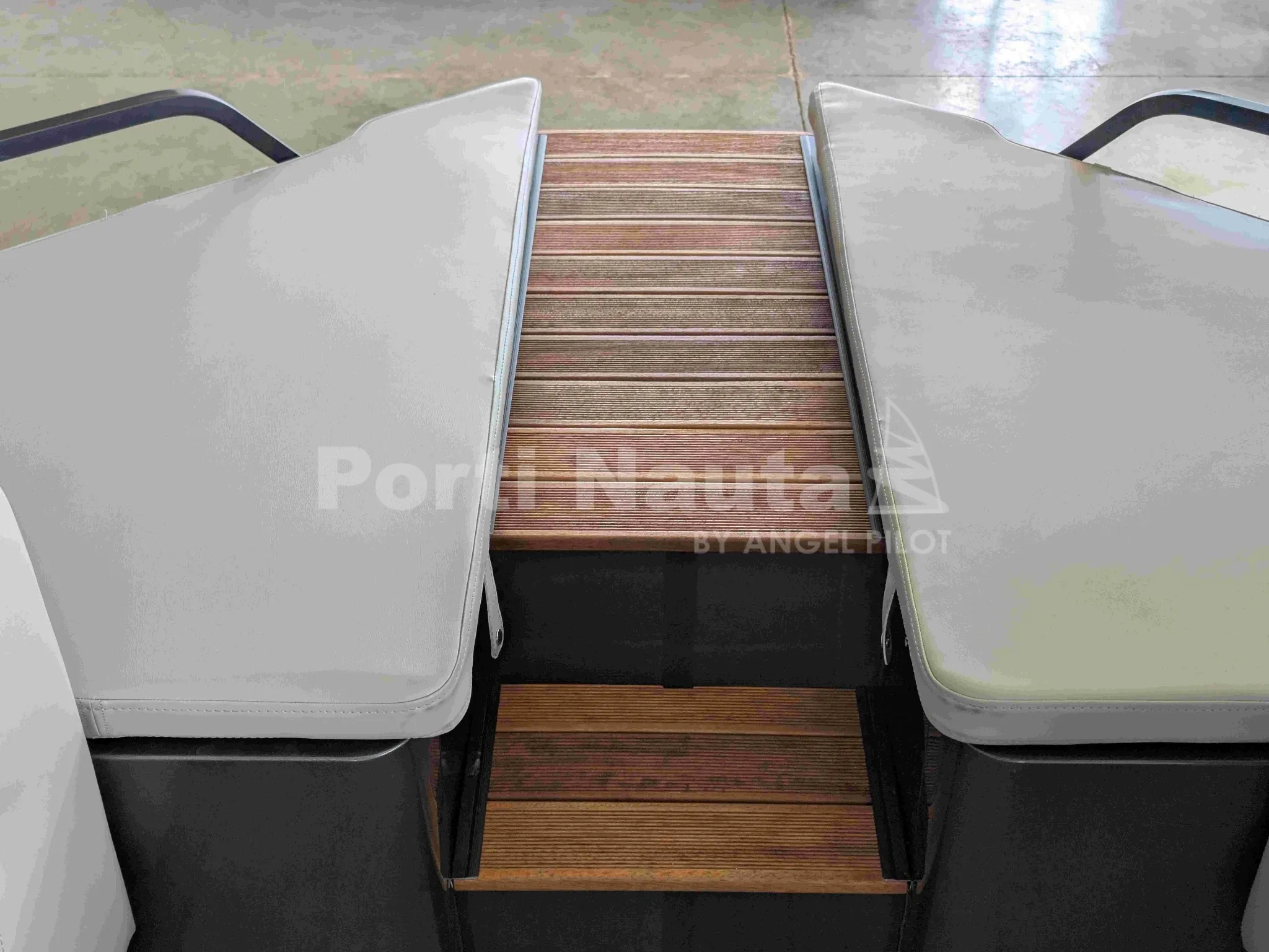 grey teak pattern – USB socket – Deluxe captain’s seat with adjustable support – Round fiberglass table with support – Small aluminium